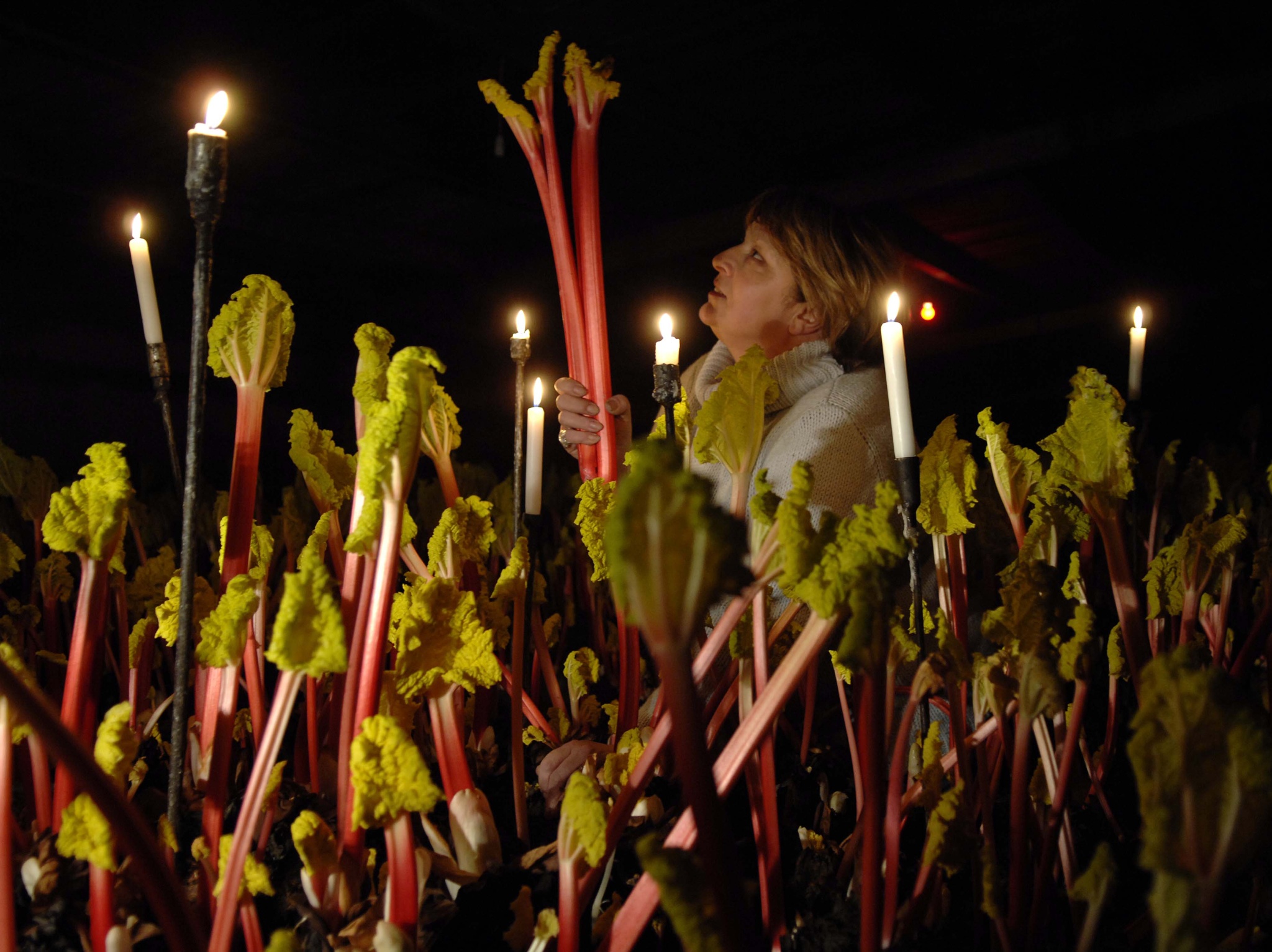 When I was growing up, everyone had a rhubarb patch in their back garden, a leftover from the War, as kids we’d dip a stick of rhubarb into a bag of sugar and happily chew away the hours. During the War the government listed rhubarb as an essential food and fixed the price at 1/- per pound. But ironically wartime rationing of sugar caused a generation of children to turn their backs on rhubarb and the industry went into a steep decline, accelerated by the arrival of cheap exotic fruit from abroad. One of the growers,  second-generation rhubarb grower Ken Oldroyd, refused to be beaten and bought up abandoned rhubarb fields, expanding the business. His daughter Janet and her son now run the business, forced rhubarb from late December to March then field rhubarb from April till September/October. They produce over 1,000 tons annually, 200 tons forced in her candle-lit sheds.