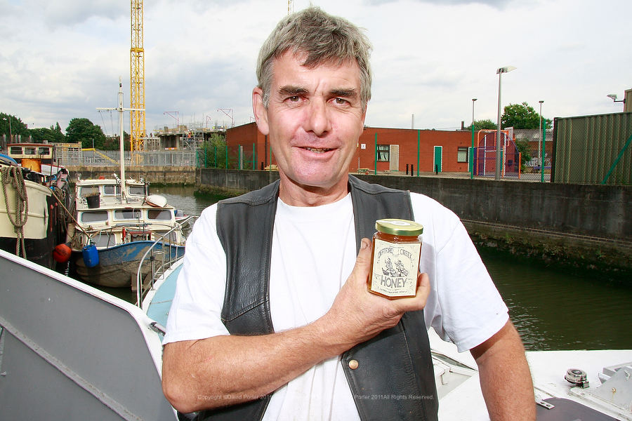 The Sabine is moored next to a builders yard full of scaffolding planks, bits of old plumbing and an old coach and an ice-cream van. Amongst all this are Julian’s 16 brightly painted hives, and besides bottling the honey Julian makes wax polish, and “pretty blinding Mead”. This year supplies are limited, most of Julian’s hives wiped-out by an unfortunate leak from a nearby workshop, one of the perils of keeping bees in an urban industrial location. But as Julian rebuilds his colony, Deptford Creek Honey will be available from time to time at the Creekside Centre.