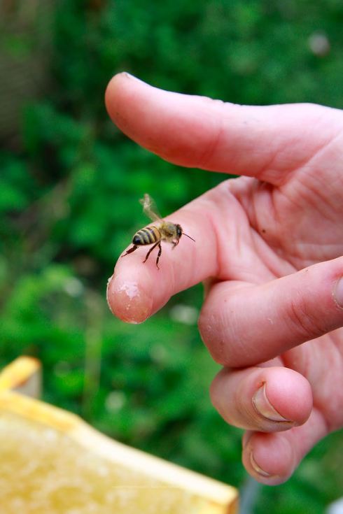 Almost immediately a bee settled on her finger, attracted by the scent of the honey. “It’s probably one of mine, from the church,” she said, “bees lives are all about self-sacrifice, these little creatures are really amazing, they create this wonderful stuff, honey!”