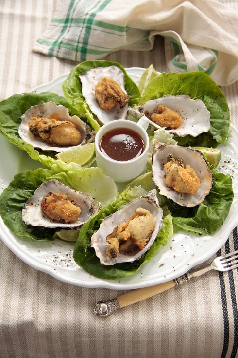 Heat the oil in a deep-fat fryer, or a deep frying pan, to 190C, then dust the oysters in the seasoned flour and dredge them in the batter. Shake off any excess and using a slotted spoon lower them into the oil. Do 4 – 6 at a time, lowering the heat slightly. Let them fry till they are golden, less than 2 minutes. Then remove and drain on kitchen paper while you fry the rest. Serve with the dressing, more pepper and a few salad leaves.