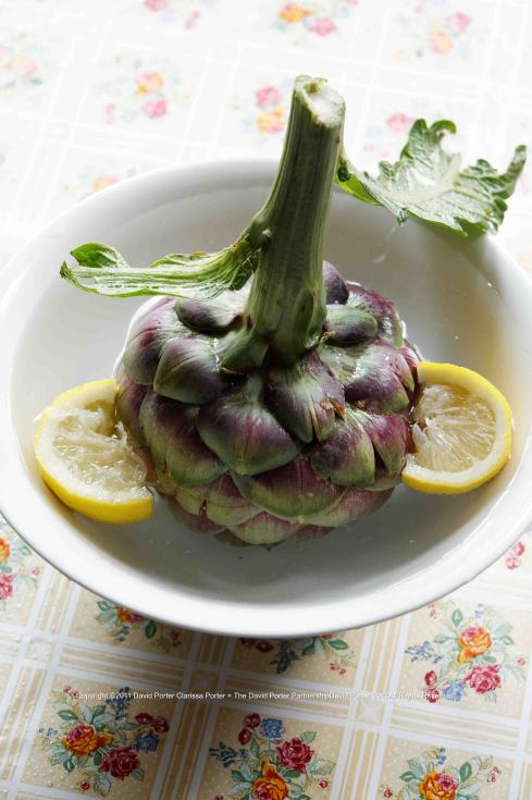 You’ll need 1 artichoke per person, soaked in lemony water with a pinch of salt, then drained.