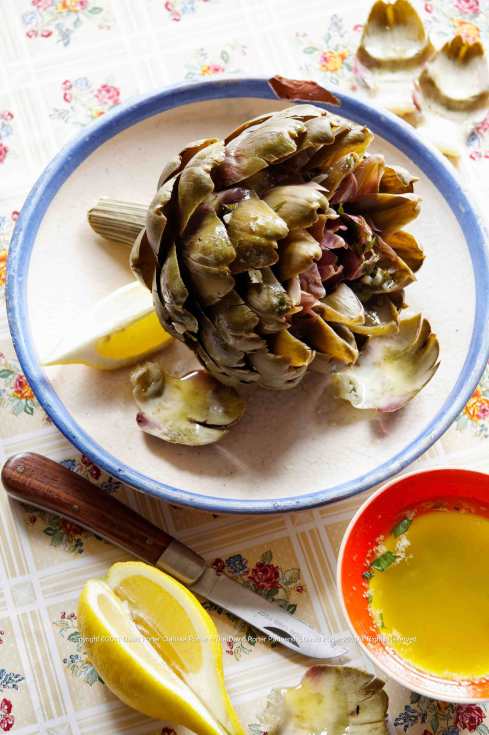 To serve, put your artichoke on a plate and open the petals a little, they’ll be loose and spread easily.  Serve the butter sauce in a pretty teacup or ramekin. When you’re very messy you’ll have eaten all the petals and reached the ‘choke’. The choke is the hairy covering of the heart. Just cut the choke away from the heart and then eat the heart. In Italy, street sellers trim most of the petals from the artichoke when you buy them so you’re just left with the delicate inner petals and the heart.