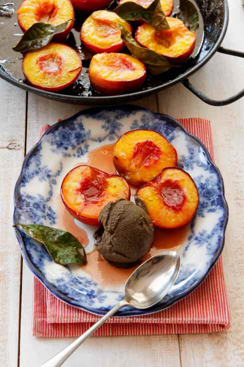 When you’re ready to serve halve the peaches and remove the stones, dust them with a little sugar and dot with butter and tuck in a few fresh bay leaves. Roast them on a baking sheet in your oven heated to 200C (400F) for about 25 minutes. Serve the peaches drizzled with the juices, and warm, along with a scoop of the ice cream and decorate with a bay leaf.