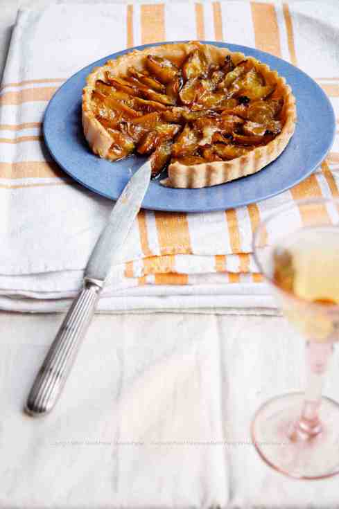 This is a recipe from Jane Grigson’s ‘Fruit Book’, and she copied the recipe from a pastry cook in Montoire about 25 miles from the Chateau at Blois. The recipe is easily adaptable to other fruit such as peaches, or several fruits mixed together. The pastry cook’s skill is to have the circles of fruit glisten and shine but at the same time prevent the pastry base becoming soggy. The trick is to use a plain shortcrust pastry and either save some of the crumb-like pastry before its rolled-out, or, when you’ve prepared the tart case take the bits of pastry you’ve trimmed off and chop them into even crumb-sized bits and then scatter them across the pastry base. I had about 1.5 kg (approx. 3 lb) of greengages, which made 3 tarts of differing sizes.